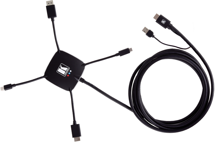 K−SPIDER is an active multi−format male input to HDMI male output adapter that enables you to connect one HDMI, DisplayPort, mini DisplayPort, or USB Type−C source to an HDMI acceptor.