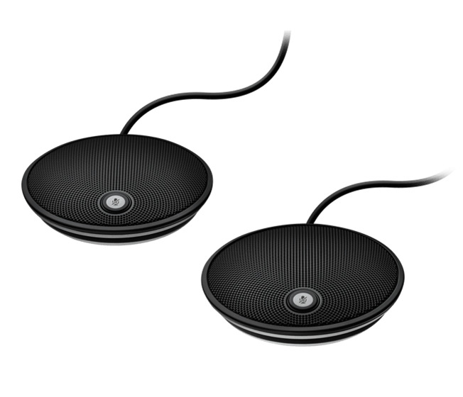 Logitech Group Expansion Mics for clear audio in large rooms.